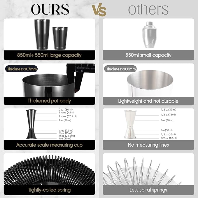 - 【DURABLE & EASY TO CLEAN】This upgraded black 304 stainless steel bartender kit is made with extra-thick 0.7mm material—super rust-resistant and tough enough for heavy daily use, with slight surface wear over time being normal. Cleanup is simple: just wash with soapy water! Its protective coating keeps the surface smooth and corrosion-free, but dishwashers damage the coating, so hand washing is recommended. Whether you’re a home cocktail enthusiast or a pro bartender, this shaker kit offers reliable durability.