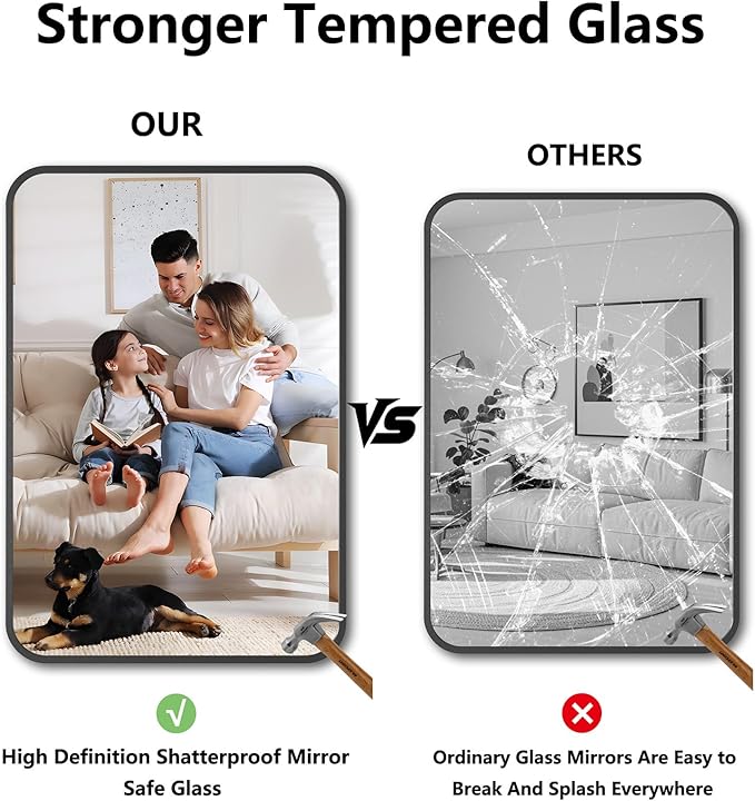 - Safe & Secure Tempered Glass: Built with shatterproof tempered glass and rust-resistant aluminum frame, this wall mirror for bathroom mounts securely above sinks. Steam-proof design withstands daily showers and heavy use—zero cracks, rust, or warping. Sleek, reliable, and perfect for high-traffic bathrooms: clear reflections, durable protection.