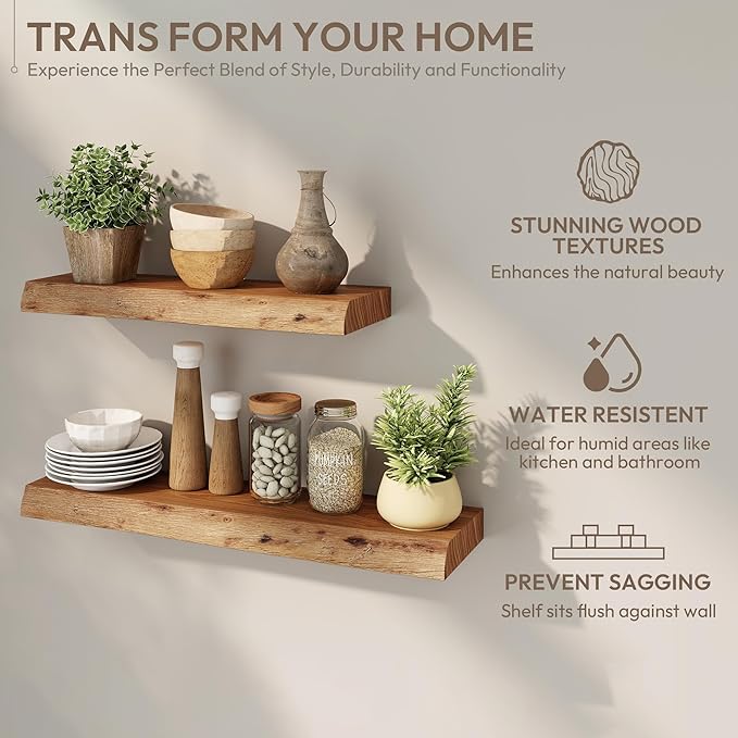 - Preserve Natural Live Edge: Each piece wood wall shelf retains raw timber edges, merging organic vitality with artistic charm through skilled live edge crafting. These unique natural edges showcase tree-grown curves, embracing imperfect perfection. Note: Width varies 5.5-6.7" due to crafting, a testament to nature's rhythm unreplicable by machinery