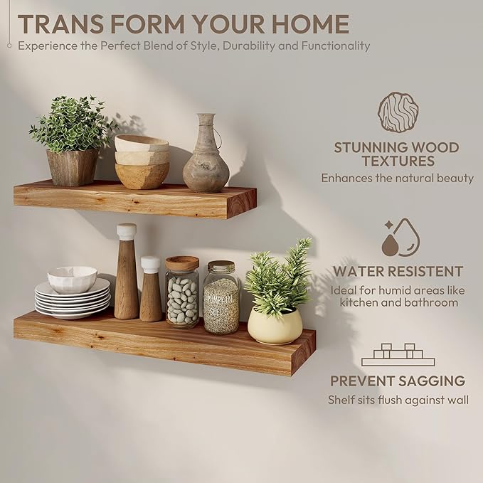 - Easy Installation: Our wood floating shelves come with all necessary hardware and a detailed guide for quick and easy installation in just 5 minutes, perfect for adding charm to your home decor. Enjoy the beauty and functionality of these rustic wall shelves