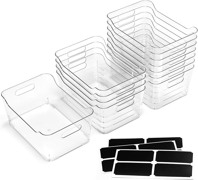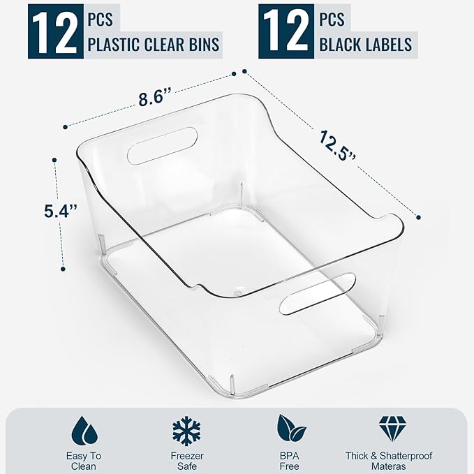 - 12 PACK CLEAR ORGANIZER BINS - Item includes 12 pcs plastic bins (12.5" L x 8.6" W x 5.4" H) & 12 pcs black labels. These clear organizer bins are made of thick clear plastic with smooth edges which are food grade and easy to clean.
