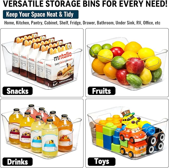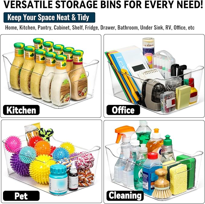 - Multiuse Bins for House Organizer - These bulk XL large clear bins are ideal home edit containers, for kitchen closet, refrigerator, pantry cabinet shelves, bathroom countertop, laundry room, bedroom, craft room, garage, office drawer desktop, RV and more. They will help create a clean and tidy storage space.