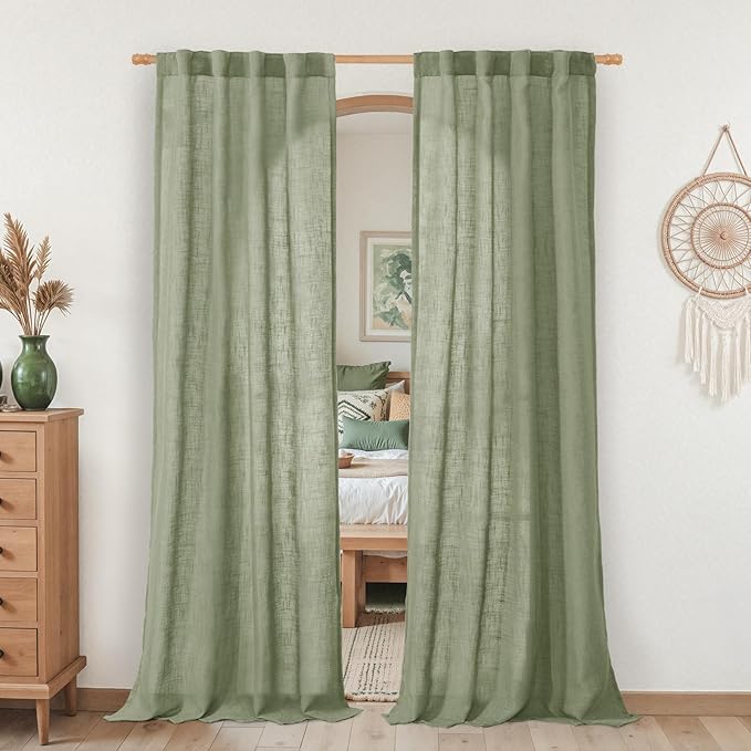 LAMIT Sage Green Linen Boho Curtains 80 inch Length 2 Panels, Light Filtering Semi Sheer Panels Back Tab and Rod Pocket Neutral Drapes for Bedroom/Living Room, 34 x 80 Inch