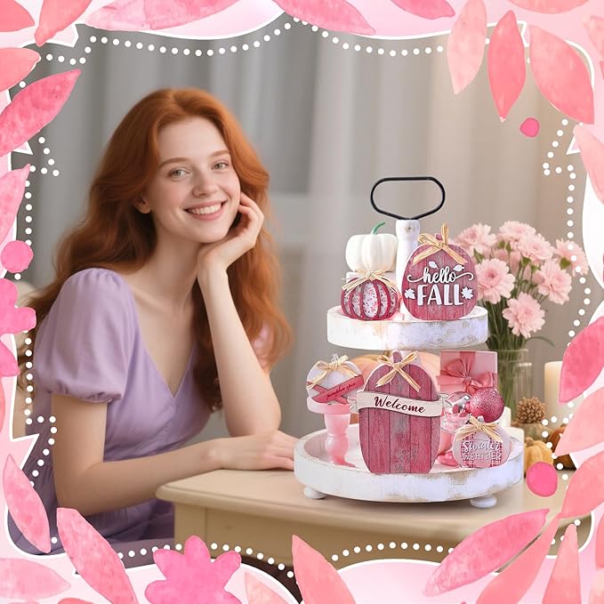 5 Pcs Fall Pink Pumpkin Decor for Home Thanksgiving Wooden Table Centerpiece Decorations Fall Wooden Pumpkin Signs for Autumn Farmhouse Home Living Room Kitchen Mantle Tabletop Supplies