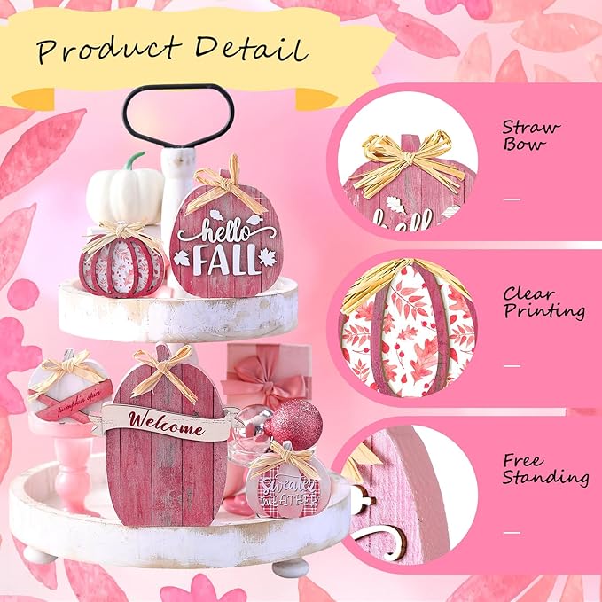 - Various Sizes: our pink fall decor come in 5 designs, corresponding to 3 different sizes, the size of the large pumpkin is 6.89 x 4.92 x 0.59 inches/ 17.5 x 12.5 x 1.5 cm, the medium pumpkin is 4.88 x 4.17 x 0.59 inches/ 12.4 x 10.6 x 1.5 cm, and the 3 small pumpkins is 3.19 x 3.19 x 0.59 inches/ 8.1 x 8.1 x 1.5 cm; The 3D straw bow and lamination design makes them more charming