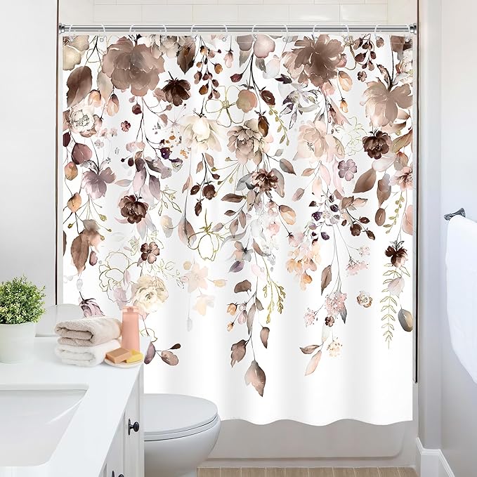 Brown Floral Shower Curtain 72Wx72L Inch Autumn Fall Flower Tan Watercolor Eucalyptus Leaf Pastel Bathroom Set Country Shabby Botanical Plant Bath Curtain Bathtub Accessories Home Decor
