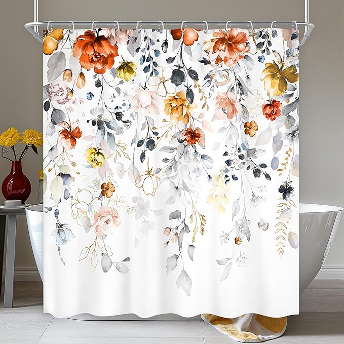 Yellow Orange Floral Shower Curtain 60Wx72L Inch Flower Pastel Watercolor Rustic Eucalyptus Leaf Bathroom Set Country Plant Botanical Shabby Bath Curtain Bathtub Accessories Home Decor