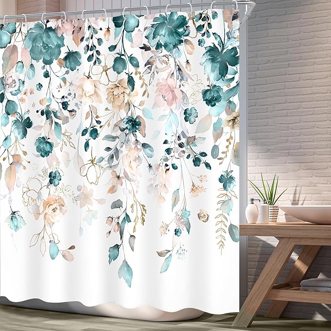 Floral Flower Shower Curtain 72Wx72L Inch Teal Green Eucalyptus Leaf Rustic Watercolor Pastel Bathroom Set Country Plant Botanical Pretty Bath Curtain Bathtub Accessories Home Decor