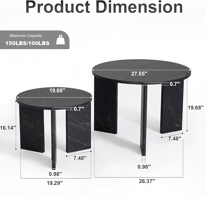 - Interchangeable Legs — Starts as one large tall table (27.6" dia. x 19.7" H) and one small short table (19.7" dia. x 16.1" H). Swap legs during assembly to create your ideal combo — large short + small high, or vice versa.