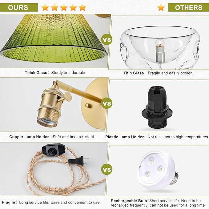 - 【Retro Design】The distinctive gradient green glass shade and brass-finished body of the plug in wall light complement each other exquisitely, establishing a vintage yet sophisticated ambiance. As light filters through shade of the sconce light, it emits a softly luminous warmth that simultaneously infuses living spaces with vitality and vibrancy, instilling a sense of serene ease