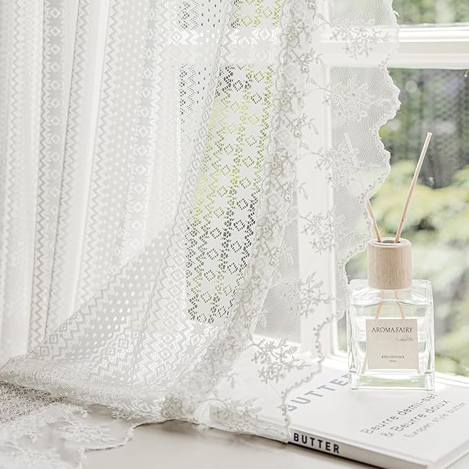 - Ready Made Sheer Lace Curtains: Crafted from premium floral lace with delicate scalloped edges, this set includes 2 panels (each 52" W × 45" L) for a total width of 104 inches—ideal for adding elegant light-filtering charm to your windows
