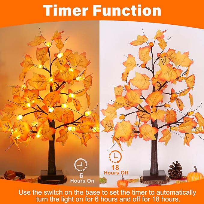 - Timer Function & Battery Opreated - Each light up fall tree features a built-in 6-hour timer that cycles every 24 hours—on for 6 hours, off for 18. Simply insert 3 AA batteries (not included), and enjoy automatic illumination without the need to turn it on and off daily.