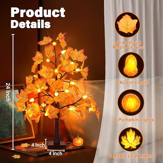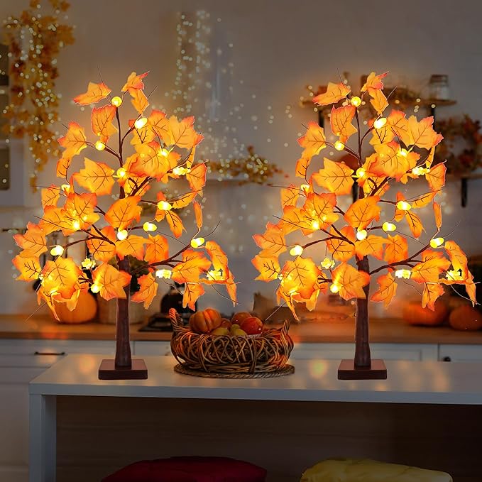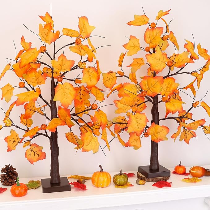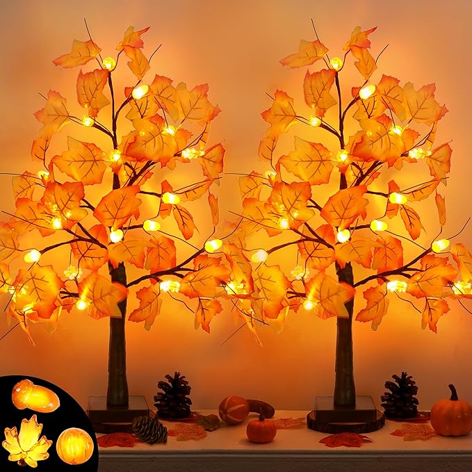- 2 Pack Fall Maple Tree Lights – You’ll receive 2 packs of 24-inch fall maple tree lights, each with 48 maple leaves, 24 warm LED lights, 8 pumpkin lampshades, 8 acorn lampshades, and 8 maple leaf lampshades. With their realistic detail and cozy lighting, these autumn trees create a welcoming harvest atmosphere—perfect for Thanksgiving, fall parties, or everyday autumn home accents.