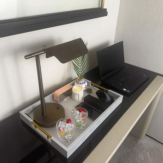 14x20 Inches Silver Faux Leather Wrapped Wood Serving Tray with Metal Handles for Various Occasions, Ottoman, Home Decor Decorative, Living Room, Coffee Table Organizer, Serving Breakfast On Bed