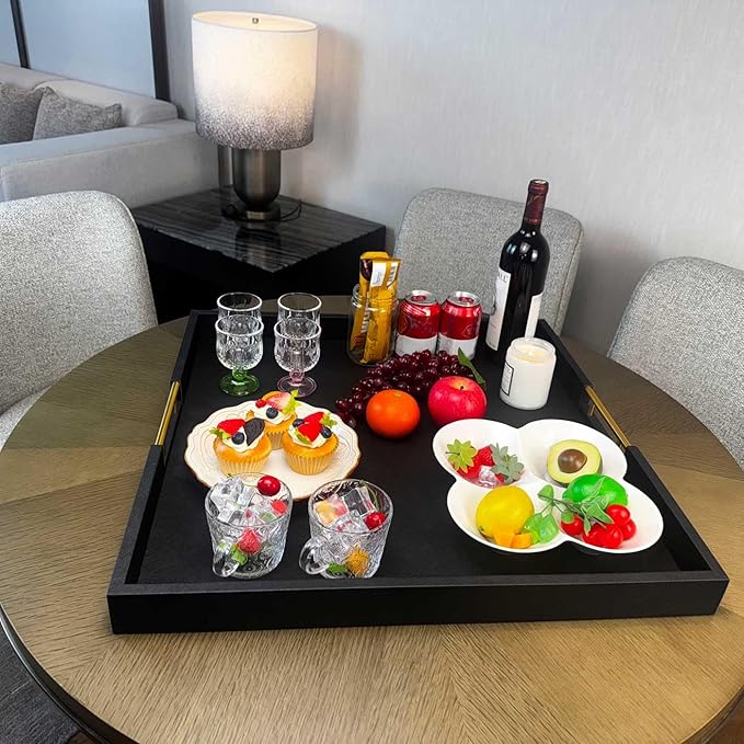 24x24 Inches Extra Large Black Faux Leather Wrapped Wood Ottoman Tray with Golden Handles for Serving Food and Breakfast On Bed, Square Coffee Table Organizer, Home Decor and Decorative