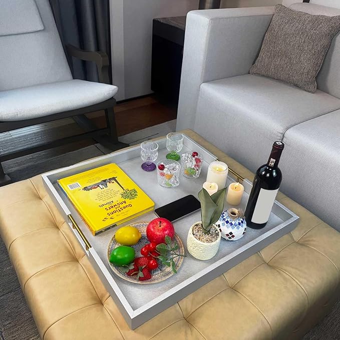 24x24 Inches Extra Large Silver Faux Leather Wrapped Wood Ottoman Tray with Golden Handles for Serving Food and Breakfast On Bed, Square Coffee Table Organizer, Home Decor and Decorative