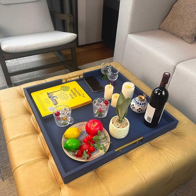 24x24 Inches Extra Large Blue Faux Leather Wrapped Wood Ottoman Tray with Golden Handles for Serving Food and Breakfast On Bed, Square Coffee Table Organizer, Home Decor and Decorative