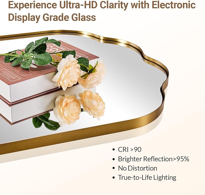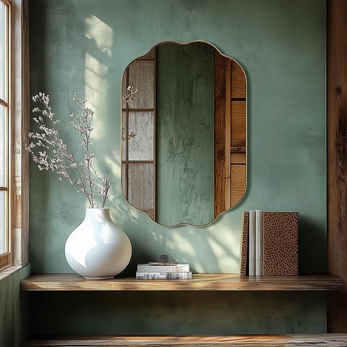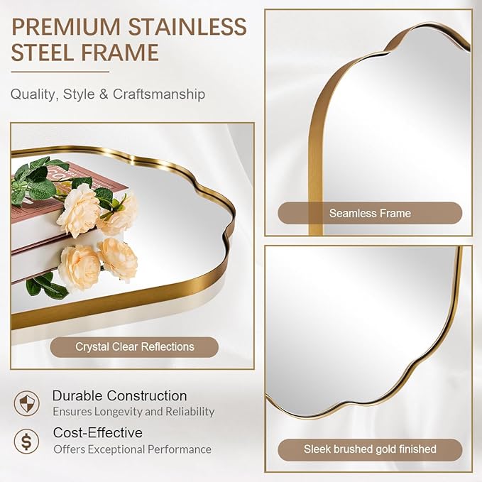 - Premium Stainless Steel Frame: Crafted from SUS304 stainless steel with a warm brushed gold finish, this frame resists oxidation—ideal for humid spaces like bathrooms. The sturdy 24x36-inch scalloped bathroom mirror, weighing 19.1 lbs, is designed to maintain its luster and stability for years