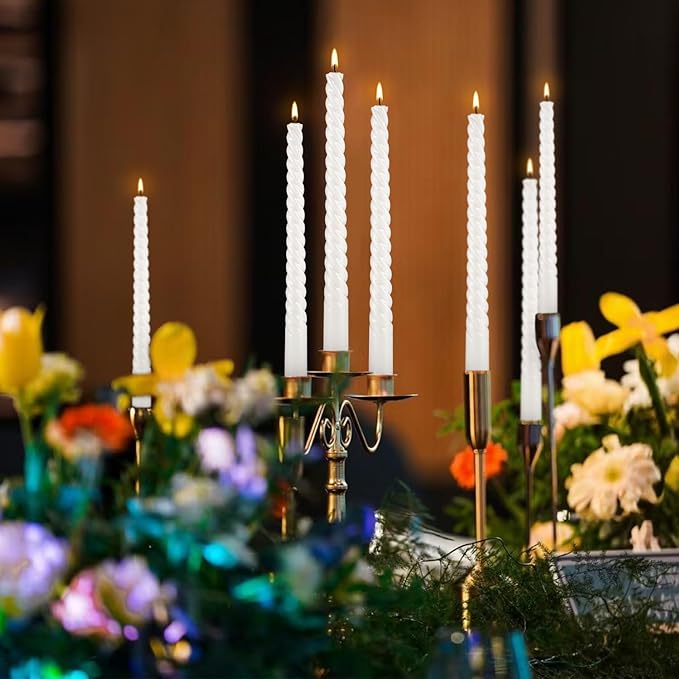 - Each pack includes 12 Spiral Taper Candles, providing you with the perfect quantity for your decorating needs.Use them as standalone accents or create stunning arrangements by combining multiple candles together. These white taper candles are ideal for wedding decorations, parties, and special holidays, adding a touch of elegance and sophistication to your celebrations.