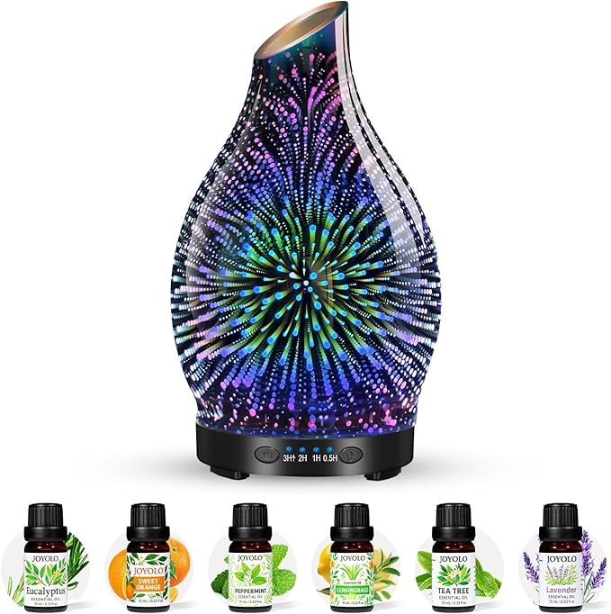 Essential Oil Diffuser & Essential Oils Set, Glass Aromatherapy Diffuser with 7 Color LED Lights and Auto-Shut Off, Cool Mist Diffuser for Home with 6 Essential Oils
