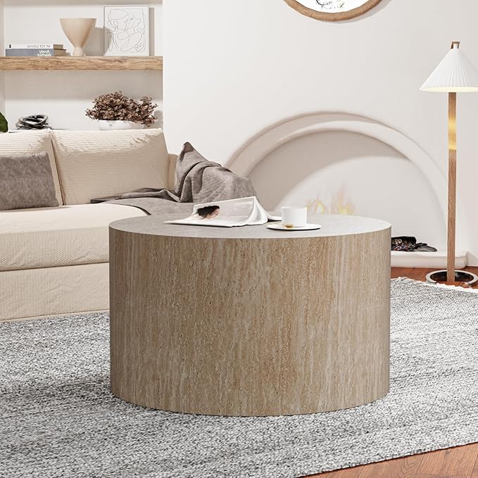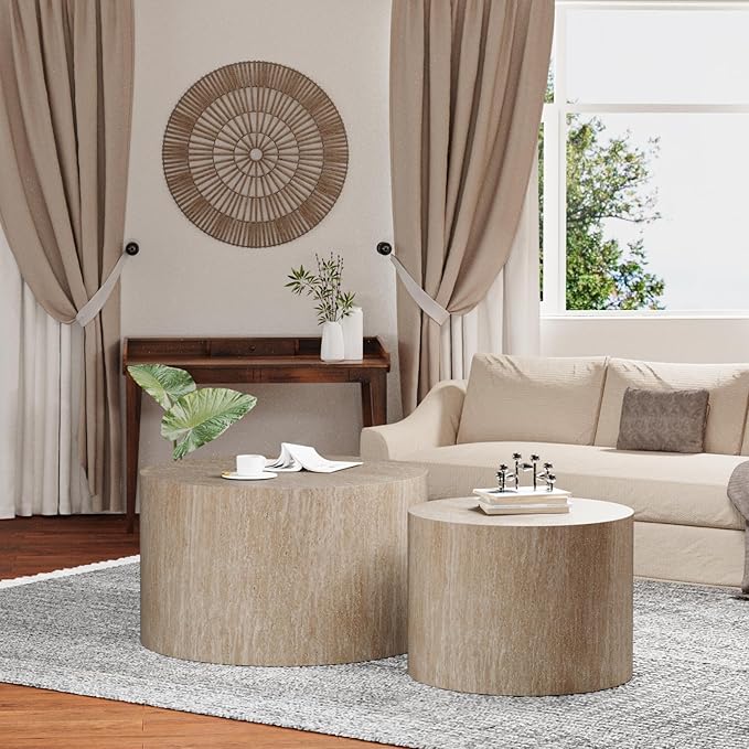 Round Nesting Coffee Table Set of 2 Modern Wood Coffee Tables Handcraft Drum Coffees Table Farmhouse Round Sofa Side Tables End Table for Living Room Small Spaces, No Assembling (Travertine Large)