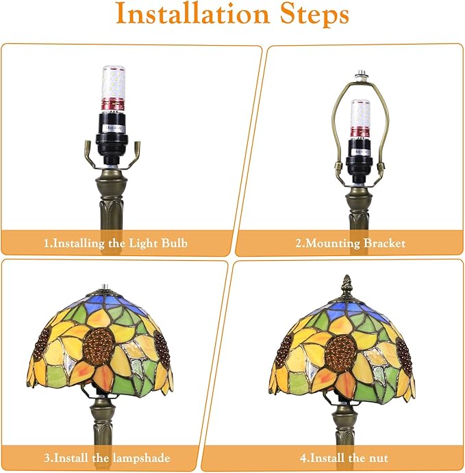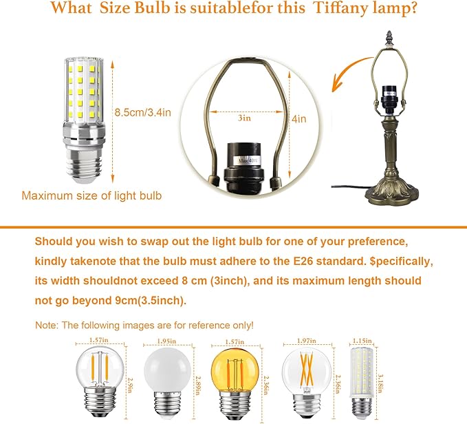 - 【Bulb Pairing Essentials】Compatible with E26 sockets. its width shouldnot exceed 8 cm (3inch),and its maximum length should not go beyond 9cm(3.5inch).Use 5W-12W LEDs (≈40W-60W incandescent brightness). ✨ Pro Tip: Bulbs >12W may dilute the softened allure of stained glass, while 12W warm light enhances Tiffany's layered glow. An 7W-12W LED strikes the perfect balance of brightness and artistry. Always securely screw in bulbs—higher watts risk overheating.