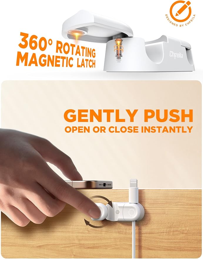 - ✅【Secure & Swift Magnetic Locking】Effortlessly manage desktop chaos with our magnetic cord organizer. The innovative magnetic lid snaps shut, locking cords safely within the cord holder. Even accidental tugs won't dislodge cables, preventing falls and tangles. Features a 360°rotating latch, allowing access in tight spaces like behind nightstands (perfect nightstand organizer) or desks. Open or close instantly, single-handed, with just a gentle push – true 1-second convenience for fast-paced home or office settings.