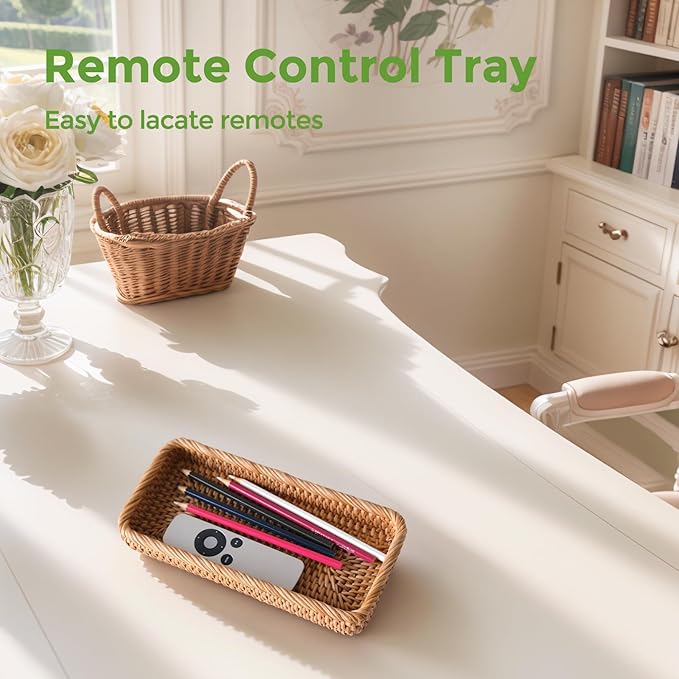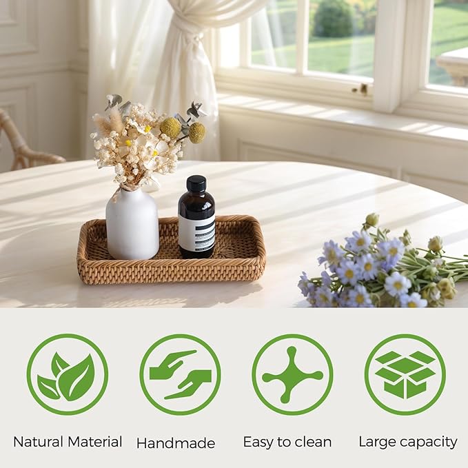 - Perfect Size for Everyday Use: Measuring 10 x 5.1 x 1.6 inches, this compact rattan tray is ideal for organizing small items like jewelry, perfume, rings, cosmetics, and stationery, keeping your space tidy and elegant.