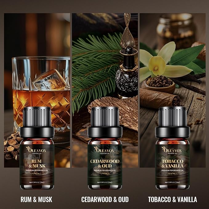 - Premium Men's Scent Collection: Discover 6 masculine essential oil blends: Agarwood & Leather, Tobacco & Vanilla, Sandalwood & Amber, Cypress & Sage, Rum & Musk, and Cedarwood & Oud. This essential oil set features rich, complex, and long-lasting quality fragrance oils for men, blending fresh woods for a truly manly essential oils experience. Perfect essential oils for diffusers for home.