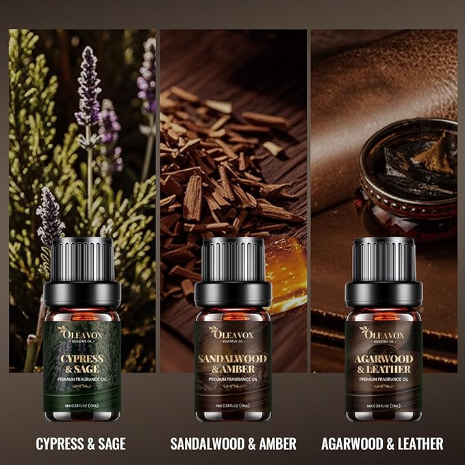 - Crafted for Confidence & Relaxation: Elevate any space or moment. Oleavox essential oils for men are designed to create a refined, masculine ambiance. Energize your morning with crisp Cypress & Sage, unwind with warm Sandalwood & Amber, or make a bold statement with deep Agarwood & Leather. Ideal for the office, car, meditation, spa, or creating a welcoming home environment.
