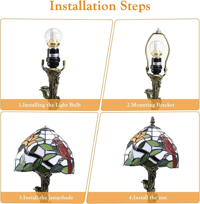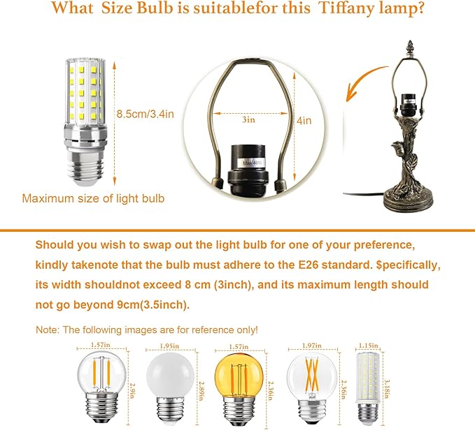 - 【Bulb Pairing Essentials】Compatible with E26 sockets. its width shouldnot exceed 8 cm (3inch),and its maximum length should not go beyond 9cm(3.5inch).Use 5W-12W LEDs (≈40W-60W incandescent brightness). ✨ Pro Tip: Bulbs >12W may dilute the softened allure of stained glass, while 12W warm light enhances Tiffany's layered glow. An 7W-12W LED strikes the perfect balance of brightness and artistry. Always securely screw in bulbs—higher watts risk overheating.