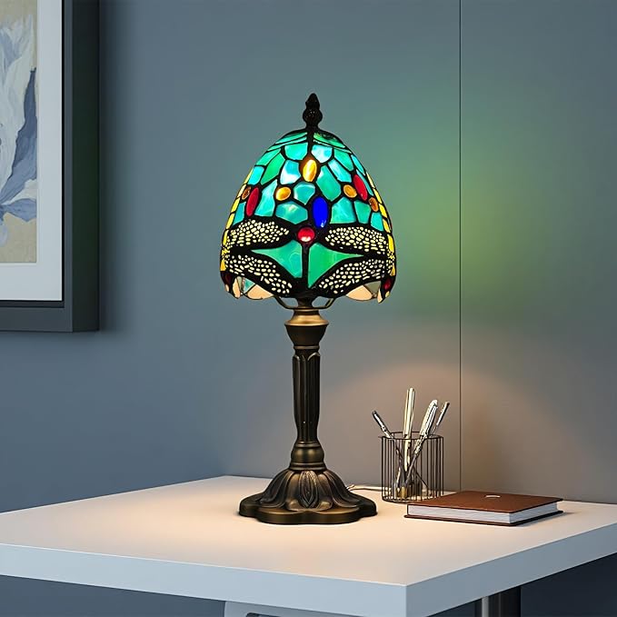 Tiffany Table Lamp,Dragonfly Stained Glass Lamp,Bedside Night Light with Included LED Bulb, Warm White Light for Bedroom/Office Decor,Small Tiffany Style Lamp