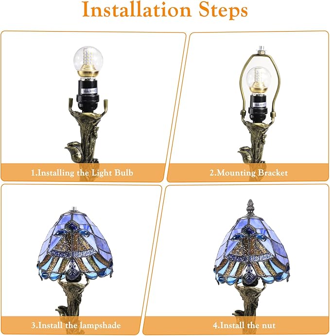 - 【Bulb Pairing Essentials】Compatible with E26 sockets. its width shouldnot exceed 8 cm (3inch),and its maximum length should not go beyond 8.5cm(3.34inch).Use 5W-12W LEDs (≈40W-60W incandescent brightness). ✨ Pro Tip: Bulbs >12W may dilute the softened allure of stained glass, while 12W warm light enhances Tiffany's layered glow. An 7W-12W LED strikes the perfect balance of brightness and artistry. Always securely screw in bulbs—higher watts risk overheating.