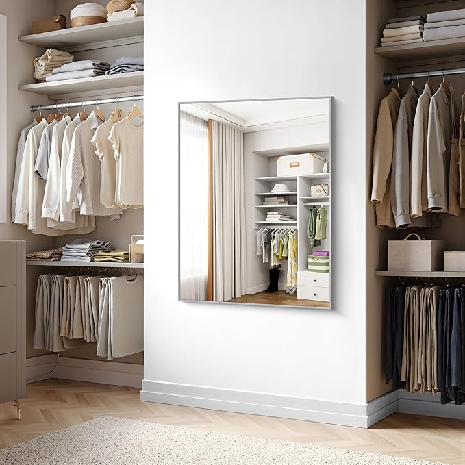 - MODERN DESIGN : KOCUUY 36x48 silver vanity mirror is with innovative design which gives the wall mirror a more fashion feel. With a classic square corner, the wall mounted mirror allows for creativity and functionality in bathroom, bedroom, entryway and anywhere else. Let your living space be an expression of your personal style, not limited to modern or contemporary, farmhouse or industrial