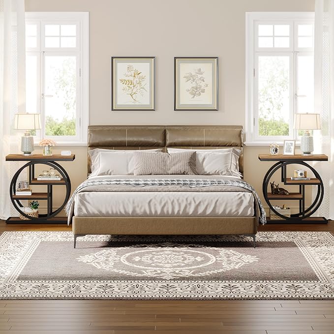 - 【Timeless Industrial Charm】: Seamlessly blending a natural brown tabletop with a matte black metal frame, this bedside table set of 2 beautifully complements any decor style. Its stylish and unique double round frame design not only adds visual depth to the piece but also makes it an eye-catching focal point in any room, sure to impress your guests.