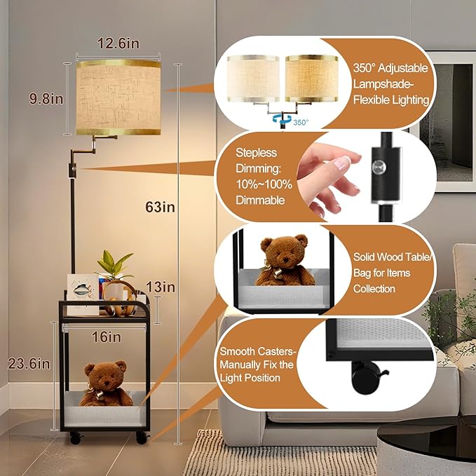 - 💡【Lamp&Storage Design】Lightdot floor lamp with table features 2-tier sturdy solid wood boards, perfect for displaying decor like photo frame, plants, or holding office essentials like laptops. The lower table comes with a storage basket, which is suitable for collecting sundries such as charging cables. Combining storage and illumination into one space-saving solution, fabric lamp head with 350° rotatable extending arm allows you to adjust how far out the light extends.