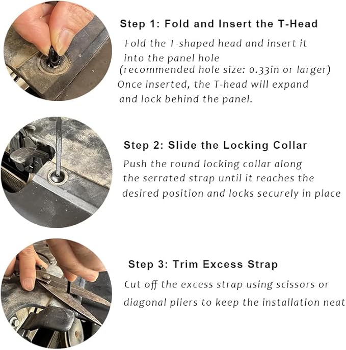- 【Easy To Install, No Tools Needed】Nylon Cable Tie Buckle Two Installation Methods: 1. Fold And Push The T-Head Into The Hole ; 2. Insert The Tail End Through The Hole If Space Allows. Simply Cut Off The Excess After Locking In Place