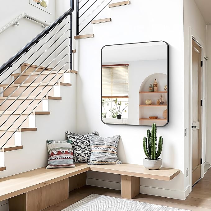 - ELEGANT ROUND CORNER DESIGN: This wall mounted rectangular mirror features smooth rounded corners design that adds a soft aesthetic to the space. The rounded corners design also help to avoid the risk of being scratched by the corners of the mirror, safety and elegance, give you a better sense of use. Not only functional but also decorative. Make your whole room elegance and enhance your home decor.