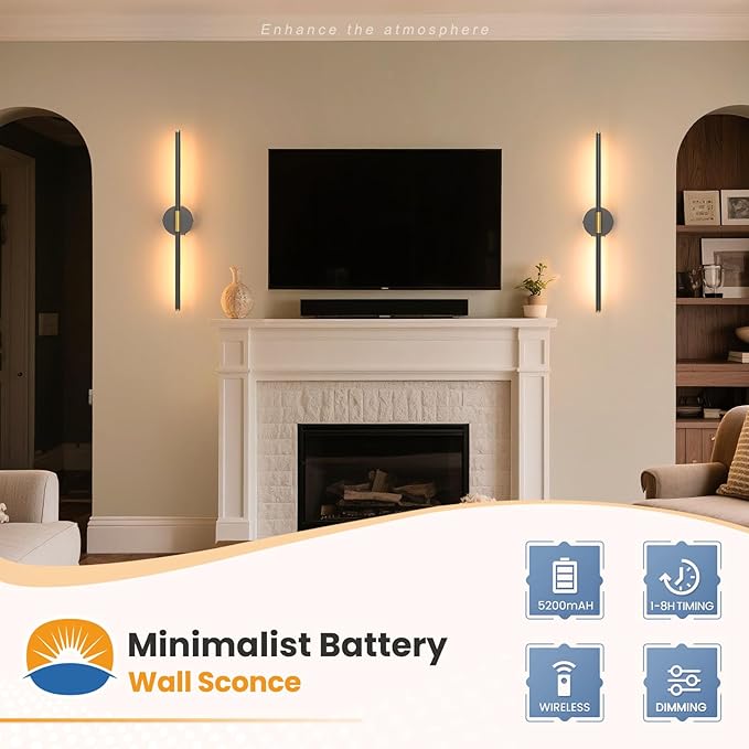 - 【Modern Design & Wide Compatibility】This wireless wall sconce set of two features a sleek minimalist design with clean lines and matte finishes, effortlessly complementing modern home aesthetics. The cordless installation allows flexible placement in living rooms, bedrooms, hallways or entryways, providing atmosphere lighting for reading nooks, accent wall illumination