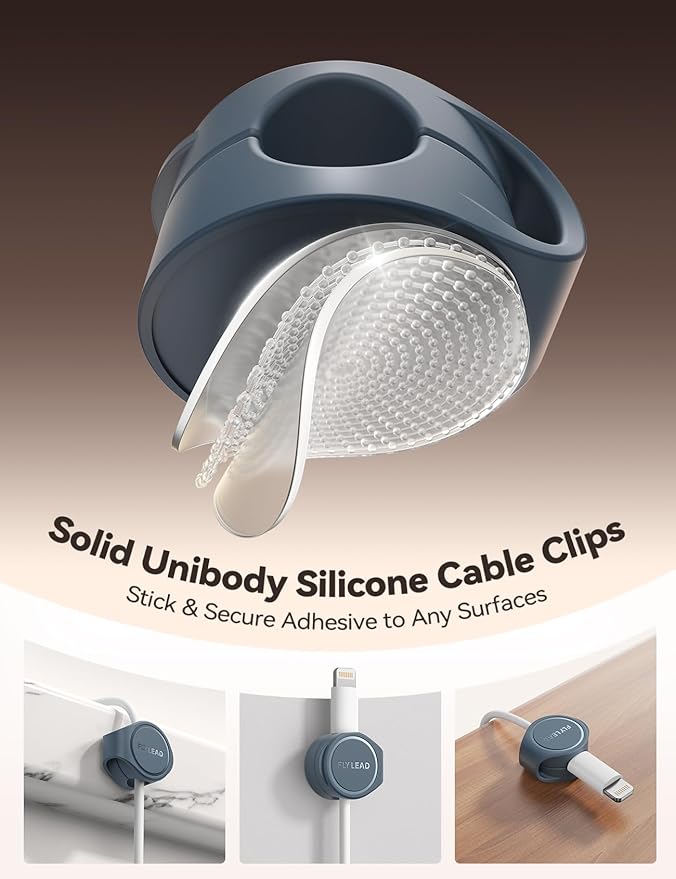 - Special Designed Silicone Magnetic Cable Clips: One-piece silicone molding design FLYLEAD cord organizer with better moldability, the soft silicone material makes this cable organizer more malleable and skin-friendly. After over 10,000 times of tensile tests, the flexible upper and lower joints never broke. With the strongest N55 magnets, covers can be tightly adherent to each other, soft silicone-made FLYLEAD cord holder could embrace cables, which won't squeeze or damage the cables