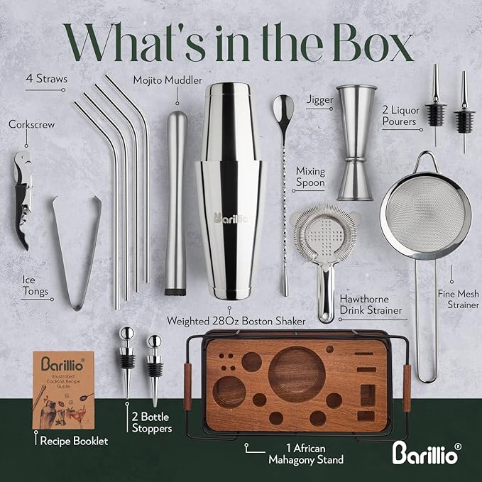 Barillio Bartender Kit – 23-Piece Stainless-Steel Cocktail Shaker Set with Premium African Mahogany Stand | Martini Barware Mixing Tools for Home Bartending | Gift Set