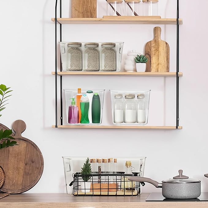 - Portable Design:Equipped with easy-grip handles, these clear storage baskets allow convenient transfer of items from the pantry to shelves or dining tables, making them ideal for daily organization. The transparent design lets you see content without rummaging, while the front-access design enables quick retrieval. Plus, they are stackable to save vertical space