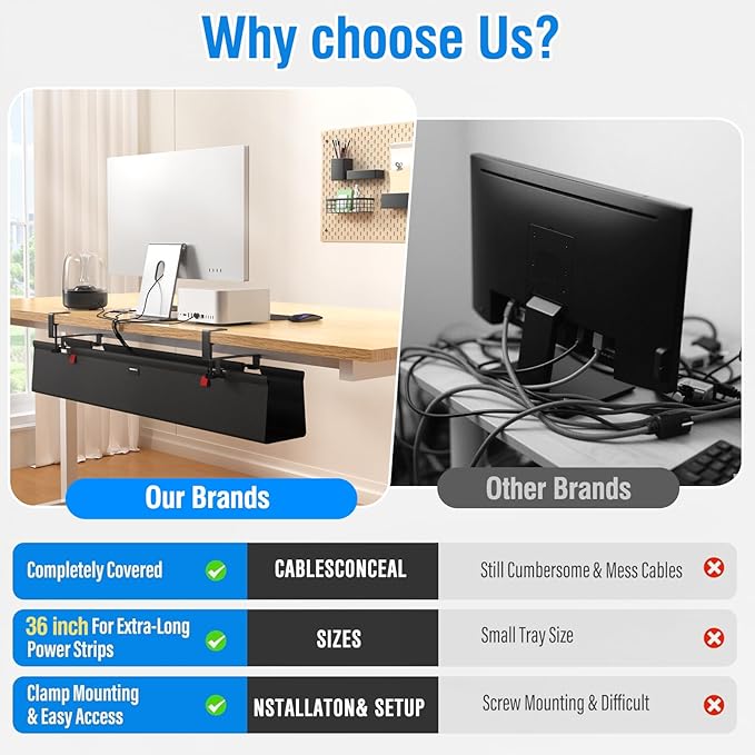 - 【Large Capacity & Practical】36 inch extra large desk cable trays fits all sizes of adapters and outlets, holds and hides everything under the table. Great idea for under table cable management. The under table cable organizer clips have built-in anti-scratch pads to protect the table, the cable basket fits desktop thickness from 0.1 inches to 2 inches.