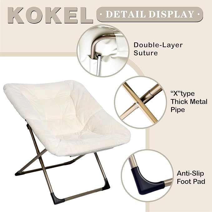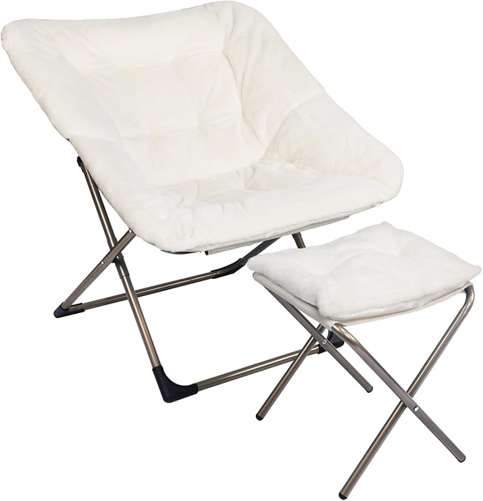 Kokel Plush Folding Chair and Ottoman Padded Metal Frame Living Room Chair (White-TM3)