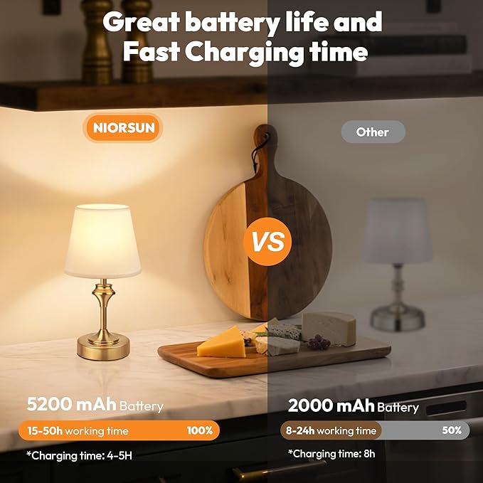 - 【3-Way Dimmable&Touch Control】NIORSUN portables cordless table lamp with three brightness settings,you can change the lighting brightness according to your different needs. Smply change the intensity of the light by touching the power button, sequentially to achieve the desired brightness. Short touch for 3-way brightness changing(100%/60%/25%).The lowest setting could be used an ambient light or night light. The highest setting is suitable for desk or bedside reading.you can change the lighting brightness according to your different needs.