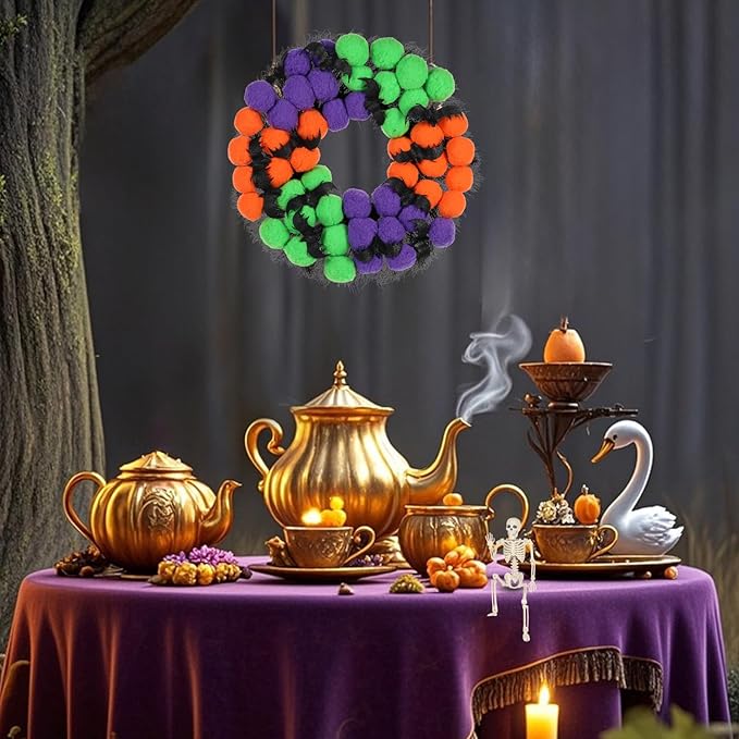 - This halloween wreaths is ingeniously combined with mysterious purple, deep black and fresh green pompom. Halloween Wreath for Front Door collision of colors releases a unique charm and easily creates a strong festive atmosphere.