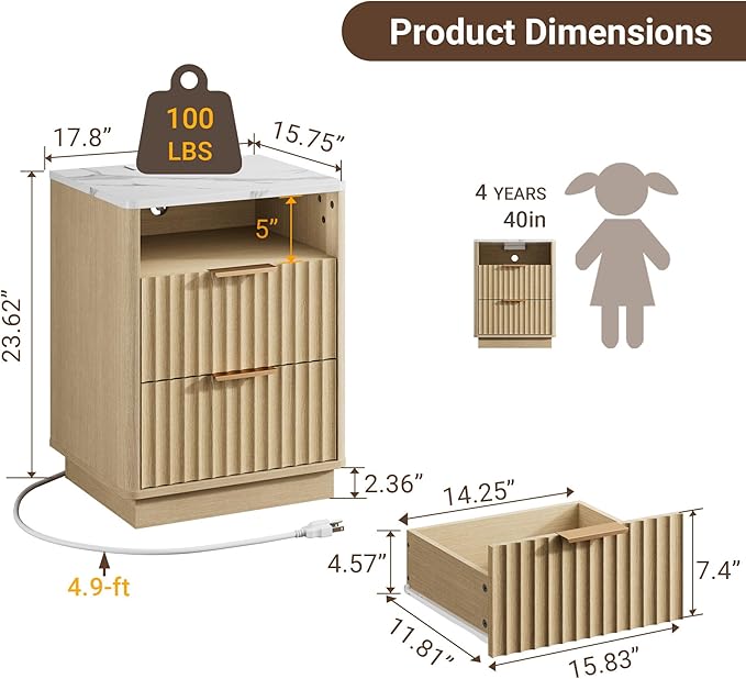 Fluted Nightstand with Charging Station, 18" Modern Night Stand with Faux Marble Top, 2 Drawers End Table with Storage, Bedside Table for Bedroom Living Room, Curved Profile (Natural Oak)