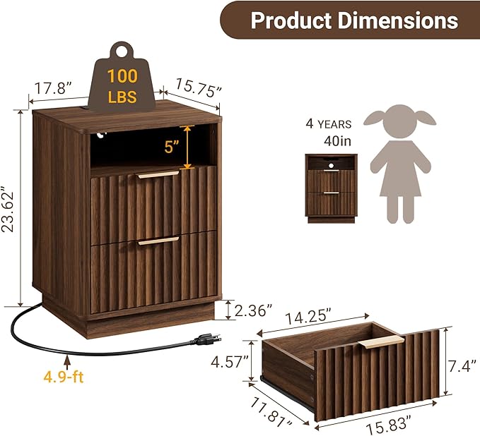 Fluted Nightstand with Charging Station, 18" Modern Farmhouse Night Stand, 2 Drawers End Table with Storage, Bedside Table for Bedroom Sofa Home Office, Curved Profile Design (Walnut)