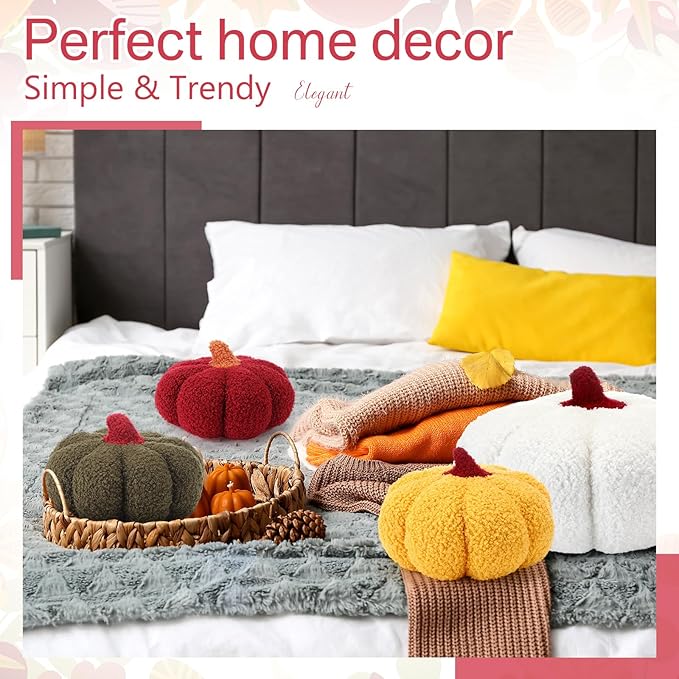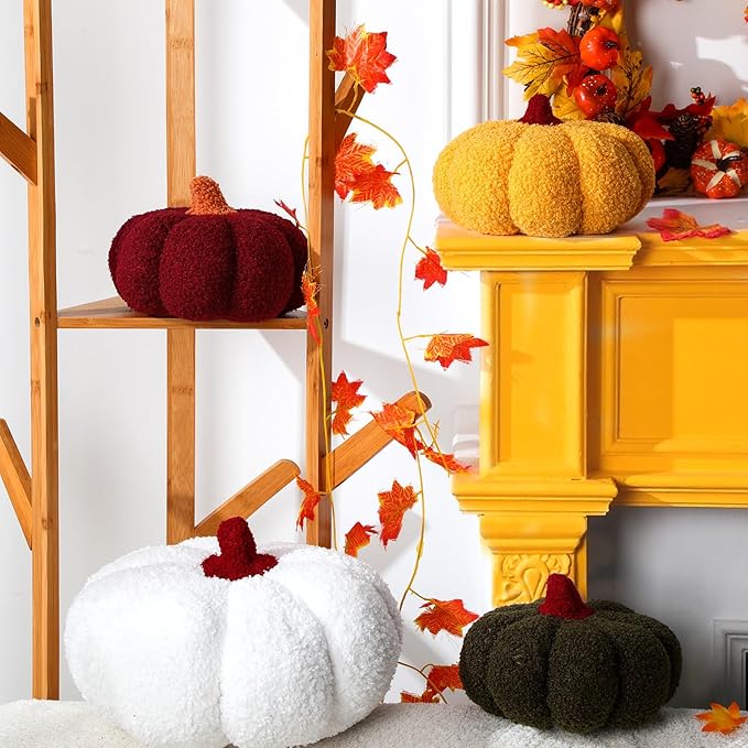 Kajaia 4 Pcs Fall Decor Pumpkin Throw Pillow Fall Pillow 11 Inches 7 Inches 3D Cushion Thanksgiving Sherpa Plush Fluffy Stuffed for Autumn Halloween Christmas Home Sofa(White,Rust Red,Yellow,Green)