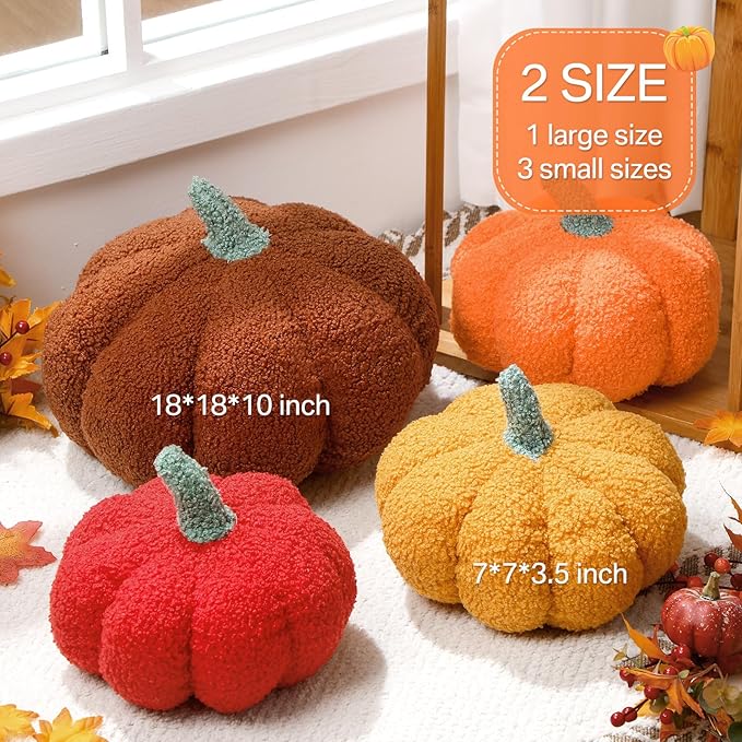 Kajaia 4 Pcs Fall Decor Pumpkin Throw Pillow Fall Pillow 11 Inches 7 Inches 3D Cushion Thanksgiving Sherpa Plush Fluffy Stuffed for Autumn Halloween Christmas Home Sofa(Brown,Orange,Red,Yellow)